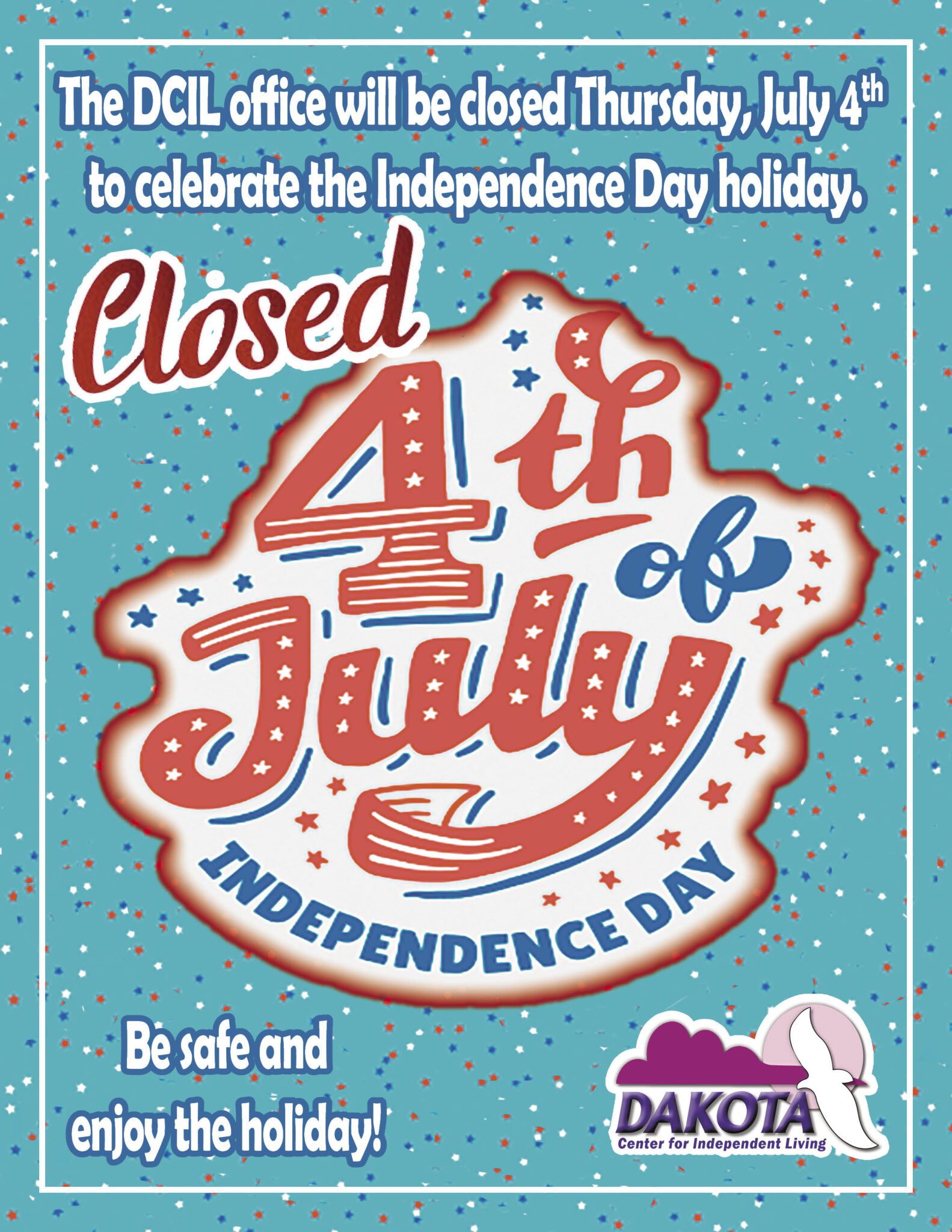 The DCIL office will be closed Thursday, July 4th to celebrate Independence Day.Date: July 4th, 2024All-day eventLocation: DCIL- Bismarck, ND